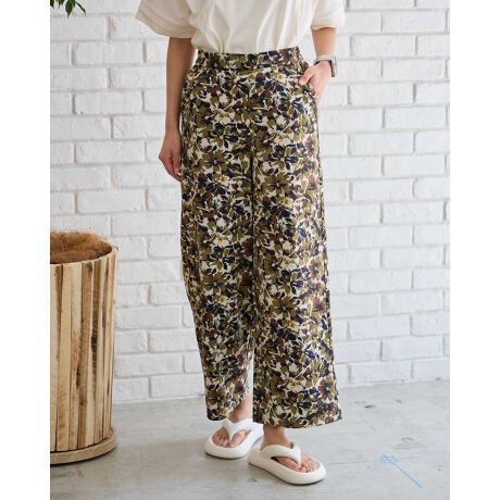 ポリエステルのツイルを使用したプリントパンツです。2色展開で柄が異なります。モカカラーは茶色の地にネイビーの葉、カーキカラーはクリーム地にカーキ系の花柄です。シルエットはアンクル丈のストレートで、後ろウエストのみギャザーゴム仕様にした開き無しのデザインです。