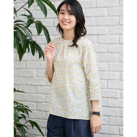 シャーリングの襟元と袖口が女性らしい雰囲気のブラウスです。1枚で様になるデザインはスタイリングも決まりやすくデイリーに活躍します。スカートにもパンツスタイルにも合わせやすいアイテムです。