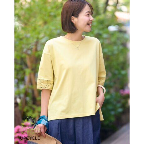 廃棄植物染めの素材を使用したTシャツです。ボディに合わせて切り替えのレースも同色に染めました。明るいイエロー系とネイビーの2色展開です。