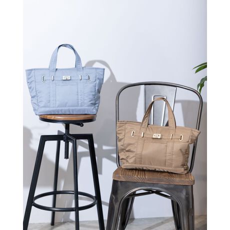 ほどよいツヤ感のあるポリエステルを使ったトートバック。裏地との間に中綿を挟みパフッと柔らかい触感でキャッチーなアイテム。小分けに便利な内ポケットや口元を留めるマグネット付き。ショルダーも付いているため両手があいて小さなお子様との外出にも便利。A4が入るサイズと11cmのマチでポーチやマイボトルの携帯収納もOK。フロントに施したメタルの留め具やオーバルカンが華やかに光るチャーミングなバックです。