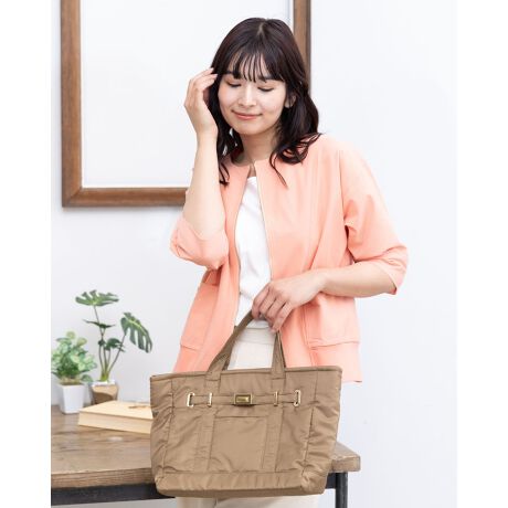 ほどよいツヤ感のあるポリエステルを使ったトートバック。裏地との間に中綿を挟みパフッと柔らかい触感でキャッチーなアイテム。小分けに便利な内ポケットや口元を留めるマグネット付き。ショルダーも付いているため両手があいて小さなお子様との外出にも便利。A4が入るサイズと11cmのマチでポーチやマイボトルの携帯収納もOK。フロントに施したメタルの留め具やオーバルカンが華やかに光るチャーミングなバックです。