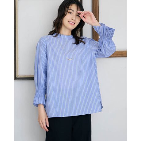キメの整った綿ポリエステルのストライプ生地は、ほのかなツヤ感もあり上品さが魅力です。袖口に施した細かいプリーツが華やかに手元を飾り1枚着も楽しめるアイテム。低めに設定したハイネックは肌露出を減らし、ロングネックレスを添えた着こなしもOK。春らしい爽やかな配色でジャケットやカーデと合わせたオフィススタイルの他、ジャンパースカートのインナー使いとしてもお薦めです。