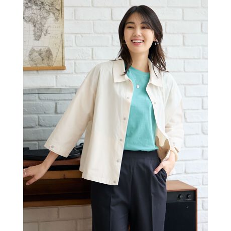 毎シーズン人気のシャツジャケット。サラッとした手触りで軽く、羽織るだけでコーデが決まる便利アイテム。今期は撥水の機能を加え、より日々の生活に寄り添う1着に。ほどよい張り感でボックス調のシルエットを保ち身体に付かず離れず涼しくお召しいただけます。トレンドに合わせショート丈に設定しているためスカートや太めのパンツとの相性も抜群。襟付きなので砕けた印象が薄れオフィスや学校行事での着用も可能です。