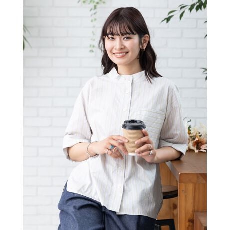 2mmほどの畝が立ち触感からも清涼感が伝わる生地。5mm幅の中の細かいストライプがアクセントになり1枚着にも便利なアイテム。ほのかな張りが活きたボクシーラインは、ほどよいゆとり感がありボトムスに合わせるだけでコーデが決まるシャツになっています。バンドカラーで顔周りがスッキリするためキャップや眼鏡を使った着こなしもお薦め。5分袖の設定で肘や二の腕など気になる部分もカバーし羽織り使いにも便利です。