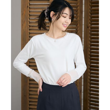 タテヨコに伸びる柔らかい天竺のボディが心地良いクルーネックのTシャツ。ジャストの肩幅設定で重ね着しやすくキャミワンピやビスチェのインナー使いにも便利。袖先に施したメッシュ生地がシンプルなボディの良いアクセントになり、フワッとクシュッと手首を包む様子も可愛いアイテムです。気温に応じてシャツやスウェットのインナー使いも楽しめ袖口でメッシュ部分を見せる着方がお薦め。スリーシーズン使える便利な1着。
