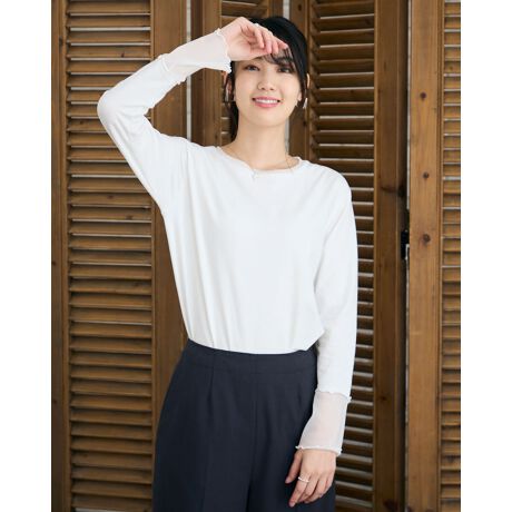 タテヨコに伸びる柔らかい天竺のボディが心地良いクルーネックのTシャツ。ジャストの肩幅設定で重ね着しやすくキャミワンピやビスチェのインナー使いにも便利。袖先に施したメッシュ生地がシンプルなボディの良いアクセントになり、フワッとクシュッと手首を包む様子も可愛いアイテムです。気温に応じてシャツやスウェットのインナー使いも楽しめ袖口でメッシュ部分を見せる着方がお薦め。スリーシーズン使える便利な1着。