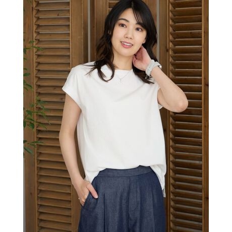 春夏のラインナップの中でもお求めやすい価格と抜群の使いやすさで人気のアイテム。オーガニックコットンの肌心地はそのままに新色を加えて展開いたします。アームホールに縫い目が無く肩先を少し覆う短めの袖丈が印象的なフレンチタイプのTシャツ。腕の露出が多い分、襟ぐりを小さくし首まわりの肌露出をセーブ。肌見えの分量に強弱があるため砕け過ぎず上品さがあるのも嬉しいポイント。