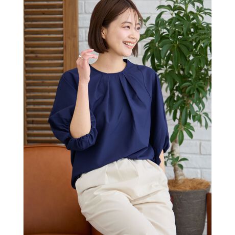 ほどよい弾力と柔らかい光沢のある生地を使ったブラウス。布帛とカットソーの中間にあるような素材で手軽にブラウススタイルをお楽しみいただけます。オフホワイトとネイビーのシックなカラー展開は他のアイテムと合わせやすく大きく膨らむ袖のディティールがほどよい華やぎになっています。シンプルなフロント部分にネックレスを添え、オフィスや学校行事でお召しになっても素敵です。パンツと合わせたスタイルがお薦めです。
