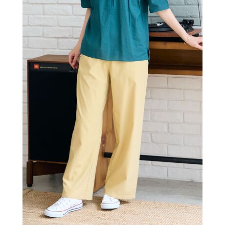 ヨコ方向のテンションに優れた生地をセレクト。強張りが無く足腰の動きがスムーズなパンツになっています。筒幅もクセの無いストレートシルエットでトップスを選ばない所も魅力。着脱に便利なプルオンタイプ。フロントのウエストはフラットな始末で着膨れをセーブ。キメの整った生地表面には、ほのかな光沢もありカジュアルすぎずオフィス使いも可能。適度な弾力もありスリーシーズンで長くお召しいただける1着。