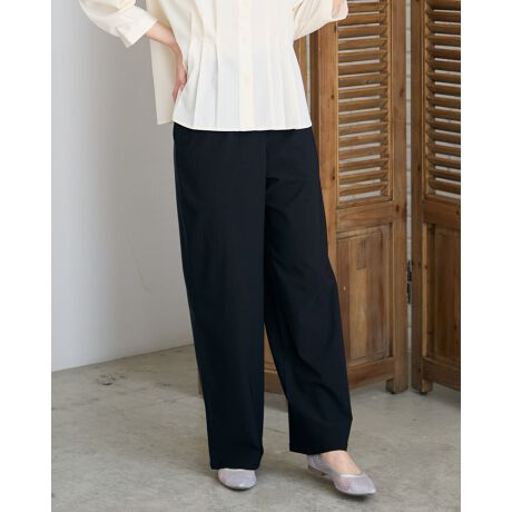 ヨコ方向のテンションに優れた生地をセレクト。強張りが無く足腰の動きがスムーズなパンツになっています。筒幅もクセの無いストレートシルエットでトップスを選ばない所も魅力。着脱に便利なプルオンタイプ。フロントのウエストはフラットな始末で着膨れをセーブ。キメの整った生地表面には、ほのかな光沢もありカジュアルすぎずオフィス使いも可能。適度な弾力もありスリーシーズンで長くお召しいただける1着。