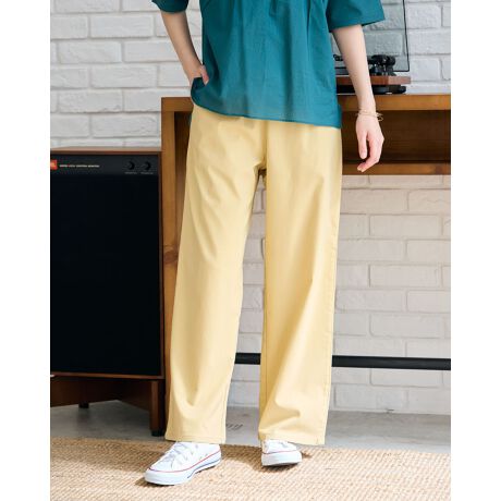 ヨコ方向のテンションに優れた生地をセレクト。強張りが無く足腰の動きがスムーズなパンツになっています。筒幅もクセの無いストレートシルエットでトップスを選ばない所も魅力。着脱に便利なプルオンタイプ。フロントのウエストはフラットな始末で着膨れをセーブ。キメの整った生地表面には、ほのかな光沢もありカジュアルすぎずオフィス使いも可能。適度な弾力もありスリーシーズンで長くお召しいただける1着。
