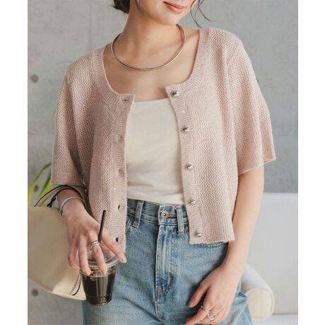 深めに開いたUネックが抜け感をプラスするニットカーディガン。トップス使いも羽織りとしてもお使い頂ける2way仕様です。春先まで使える五分袖が嬉しいポイント。光にあたるたびにほんのり輝くラメ×スパンコールが上品で高見えします◎