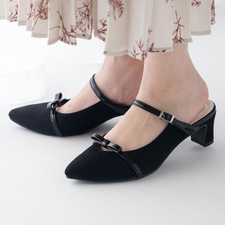 華奢なダブルベルトと上品な風合いの生地素材を組み合わせたミュールパンプス。