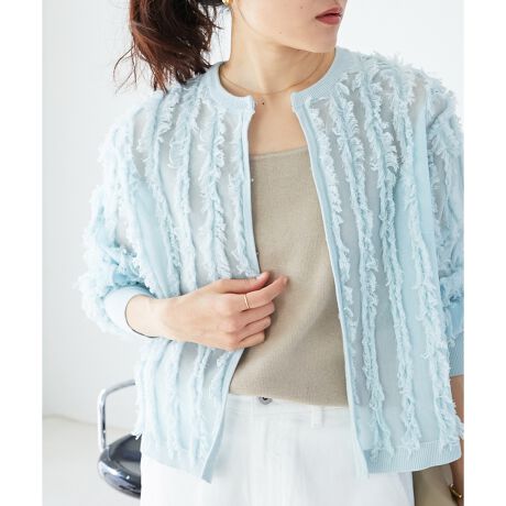 [型番:3053020802]表面のフリンジデザインが可愛いニットカーディガン。●ポイント表側に綿100%、裏側にハリ感のある透糸を使用。綿の糸をカットしてフリンジを作っています。ややコンパクトめのサイズ感で表面のフリンジデザインと透け感もあるトレンドライクなアイテムです。●おすすめコーデサラッとTシャツやタンクなどのインナーに羽織ったり、首元からバストまでホックがあるので、留めてカーディガン風にも着て頂けます。