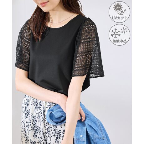 ・レース素材のフレアスリーブで切り替えた、異素材ミックスのカットソー。