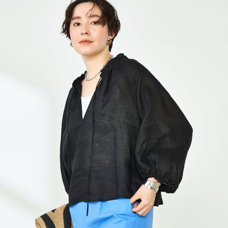 ・夏を快適に過ごせるリネン素材を使用した衿フリルブラウス
