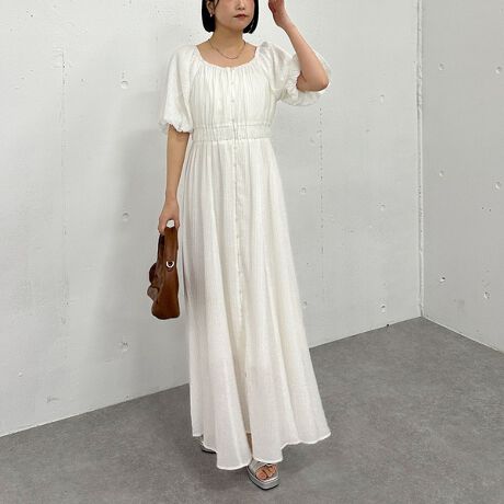 1枚着はもちろん、前ボタンは裾まで開けることができるので、デニムなどをレイヤードしてカジュアルに着こなすのもおすすめ◎