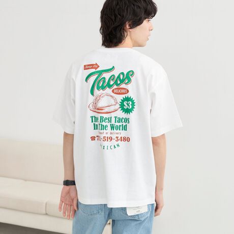 アメリカンなフードショップモチーフを大胆にプリントしたTシャツ。