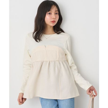 さらりとした綿100%カットソーに、爽やかなストライプ柄のサッカー生地をビスチェ風にドッキング。ボディラインを拾わないサイズ感と、バックシャーリング仕様で快適な着心地を実現しました。ウエストにはギャザーを施し、女性らしくふんわり広がるフレアラインに。1枚でコーディネートが決まるおすすめのアイテムです。透け感[ややあり]