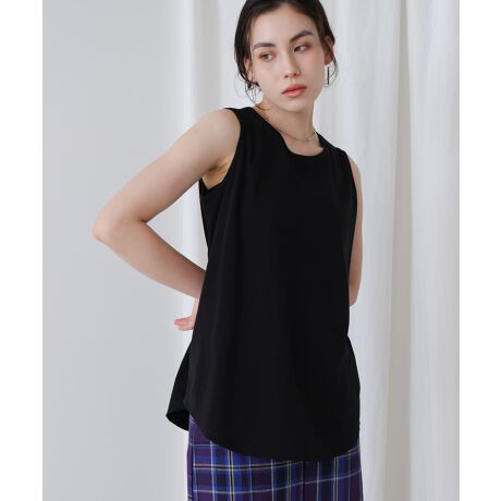 インナーとして1枚は持っておきたいタンクトップ。腰回りを隠してくれるやや長めの丈に裾のラウンドカットでスッキリ見え、重ね着にもマッチ。