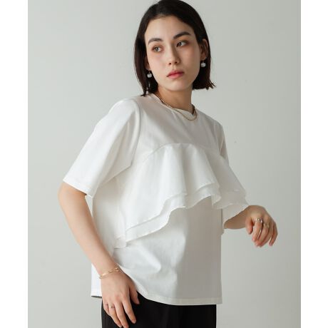 胸元部分にふんだんにあしらったフリルが印象的なカットソー。形はカジュアルなTシャツなので、デニムなどにも合わせやすいです。