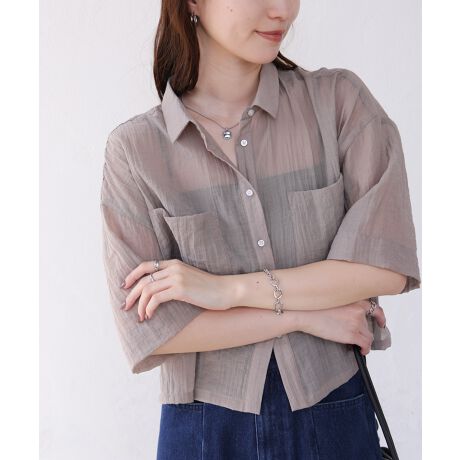 表面がぽこぽこした透ける素材なので単調になりすぎない素材のコントラストが楽しめる1枚。さらりとした合繊素材でしわになりにくいので軽いお出かけにも持ち歩きたいシャツブラウスです。