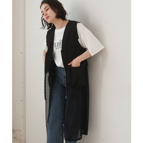 大人が楽しめるワークジレ。アイレットレースを使用して、きれいめカジュアルに仕上げました。ボトムをレイヤードさせて透け感を楽しめるアクセントジレです。フロントのジップとゆるっとしたポケットがポイントです。着脱は、フロントジップ。