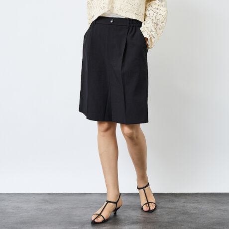 ゴム仕様のウエスト、フロントのタックでリラクシーな履き心地でありながら、センタープレスでキリッと縦ラインを強調し、カジュアルすぎずスッキリした印象に。