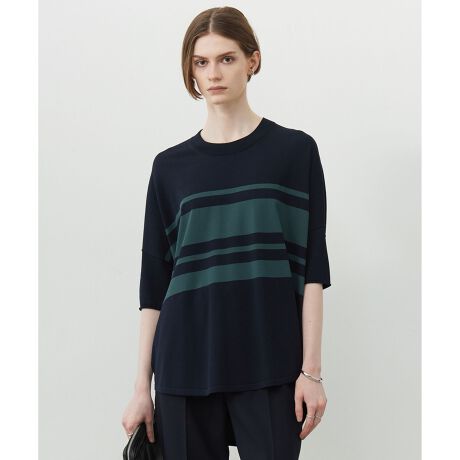 ■デザインTシャツのような気軽さと、ニットらしい上品な雰囲気を併せ持った半袖プルオーバー。ワイドシルエットでリラクシーなボディーは前後差のあるラウンドシルエットで軽やかに、抜け感のあるシルエットながら袖はすっきりコンパクトにすることで、メリハリのあるシルエットがモードな印象です。ニットならではの質感でカジュアルになりすぎずキレイ目に着ていただけます。