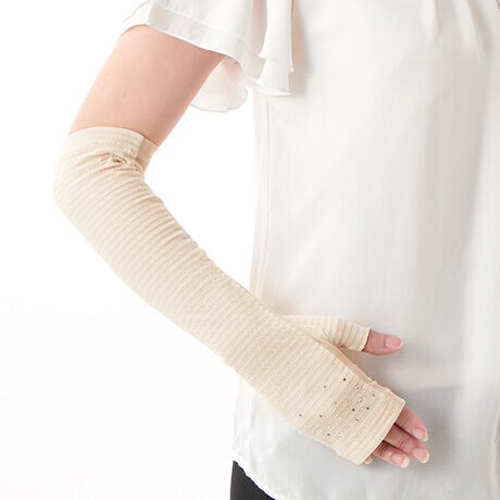 [型番:4141LA5702195]シアサッカーの生地にキラキラストーンを付けた人気のあるデザインです。指無しセミロングタイプ。長さ:35cm。
