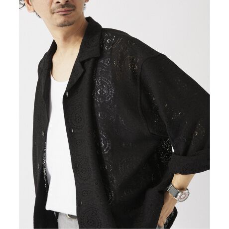 大人の抜け感を演出する、ペイズリー柄レースのオープンカラーシャツ。