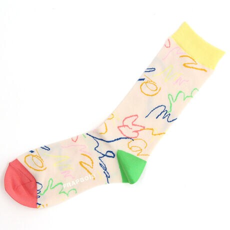 【素材】発色が良くストレッチ性も富んだ糸を使ったソックス。【デザイン】グラッフィー柄を大胆に再現したカラフルで繊細なソックス。アーティスティックで大人っぽい雰囲気でモードなイメージをつくっています。Fサイズ:24〜27cm*こちらの商品はユニセックス商品です。【ブランド情報】FRAPBOIS/フラボア2001年にブランドスタート。「大人げない大人の服」をコンセプトに、大人が着るリラックスしたデイリーウェアを提案するコレクションブランド。レディースとメンズのアイテムをご用意しています。https://frapbois.jp