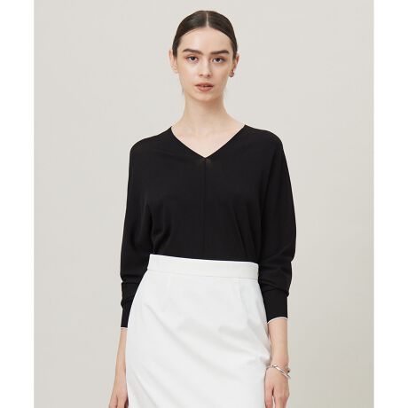■素材ブライトレーヨンフィラメント糸とマットな表情のナイロン糸をブレンドした細番の糸を使用しています。柔らかな肌触りの中に適度なハリコシ感もありますので、ハイゲージに編むことでより上品なツヤ感が生まれ上品見えを叶えてくれます。暑さを感じる時期にでも涼しく快適に着ていただけるひんやりとした触感(接触冷感機能)や、UVケア機能も搭載。春先から盛夏まで着用していだだける素材感になっています。