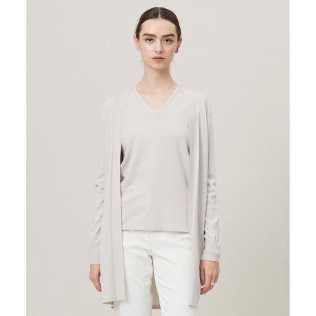 ■デザイン真っすぐにおちた衿ラインが上品な着流しロングカーディガンです。ボタンレスでミニマムなデザインでオンオフ問わず活躍します。柔らかな肌触りの中に適度なハリコシを持たせたコンパクトな目面で編まれており、ボディーラインをシャープにすっきりと見せてくれます。普段使いからお出かけ、冷房対策としても幅広いシーンで活躍すること間違いなしアイテムです。同シリーズのニットと合わせてアンサンブルでの着用もおすすめです。