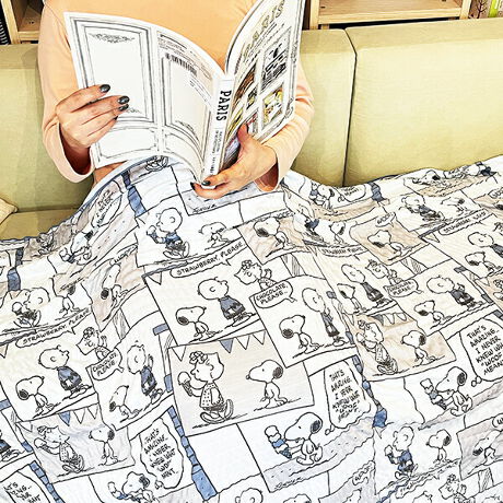 スヌーピーのコミック柄のクールハーフケットです。手触りはガーゼのようですが優しい冷たさが嬉しい♪こちらはグレーです。