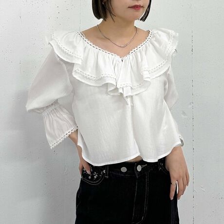 少し甘めデザインのブラウスも肌見せで大人っぽく。