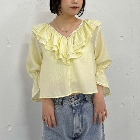 少し甘めデザインのブラウスも肌見せで大人っぽく。