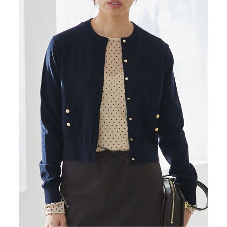 ポケットとメタルボタンがポイントのクルーネックカーディガン。