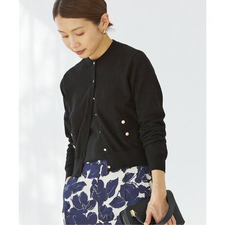 ポケットとメタルボタンがポイントのクルーネックカーディガン。