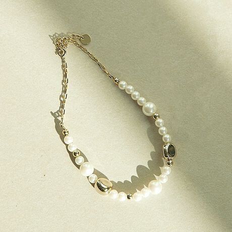 ゴールドの華奢なチェーンに、大小のパールが連なる、洗練されたデザイン。