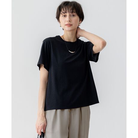 極細番手のラメ糸を使用した上品で煌びやかな素材を使用したTシャツ。ベーシックなデザインとさり気ないラメ感は大人でも取り入れやすく、デイリーなスタイリングにも活躍します。肩回りをすっきりコンパクトなサイジングにすることで、女性らしい華奢な印象を演出。仕様も極力シンプルにすることで、一枚で着るのはもちろん、ジャケットやシャツのインナー、キャミワンピなど、あらゆるコーディネートと好相性です。カラーはシックなブラック(#005)、顔まわりを明るく見せるゴールド(#090)、クールな雰囲気のシルバー(#091)の3色展開です。