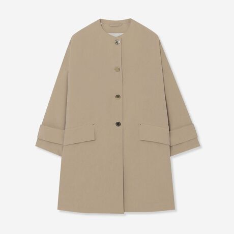 ドロップショルダーのノーカラーショートコート「HUMBIE NO COLLAR」。Aラインフォルムでシーンやスタイルを選ばないデザインです。ブランドロゴを配したゴールドボタンがアクセントになっています。