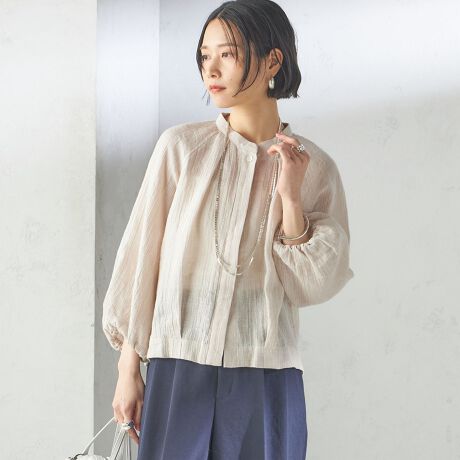 柔らかい雰囲気の生地にギャザーで丸みを出した、ショート丈のラグランスリーブのブルゾン型ブラウス。
