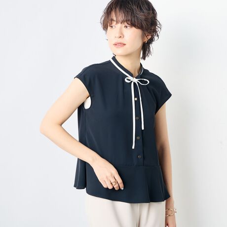 ・リボンは取り外し可能で、外すとスキッパーのように開いた襟元になり、顔周りすっきり見え