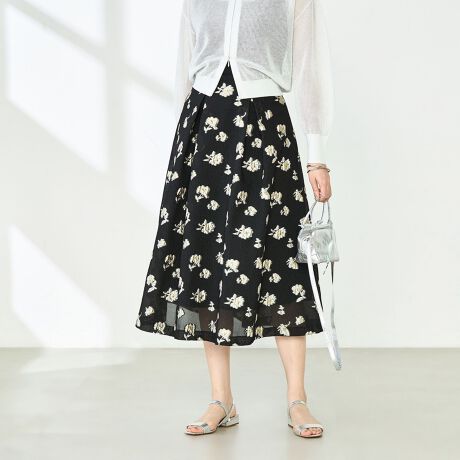 ・ラメ混の大きめフラワー柄が目を引くカットジャガード素材のスカート