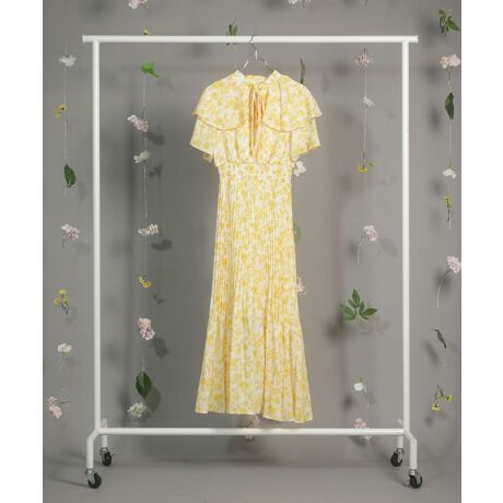 春らしいムードのオリジナルパターンで仕上げた花柄ワンピース。シフォン生地で軽やかなシルエットに仕上げ、エアリーな雰囲気が華やかさを際立たせてくれる1枚です。胸元には取り外し可能なボウリボンがあり、その日の気分で取り外しが可能です。袖はトレンドのケープデザインに落とし込み、ひらりとなびくアクセントに。ウエストシャーリングで、ストレスフリーな着心地が魅力です。スカート部分にはプリーツを入れ込んで立体感をプラスし、写真映えにも期待のデザインです。透け感[ややあり]