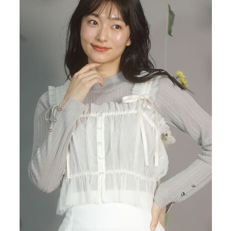 シンプルなコーディネートの相方に添えたい、スタイリングにワンポイントの魅力をプラスするアイテムです。チュール素材はシアー感が美しい生地を選定。2枚仕立ての優しい透け感とボリュームのあるギャザーフリルでフェミニンな仕上がりに。ショルダー部分はリボンで微調整もでき、身頃はシャーリング仕様でフィット感も抜群。目線を上に向けて脚長効果も期待できる着回し力の高いアイテムです。透け感[あり]