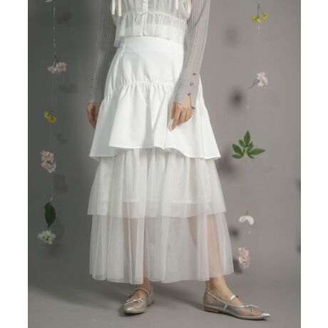 トレンド感のある、ロマンティックボヘミアンな雰囲気をお楽しみいただける1枚です。ツイル素材とチュール素材を掛け合わせ、カジュアルさとフェミニンさを融合させたデザインに。腰回りはすっきりと見せ、ウエスト後方のシャーリングでINスタイルにも最適な仕様に仕上げております。同素材でのブルゾンを合わせたSETUPスタイルや、夏場はシンプルにTシャツ合わせのカジュアルスタイルもおすすめです。透け感[あり]