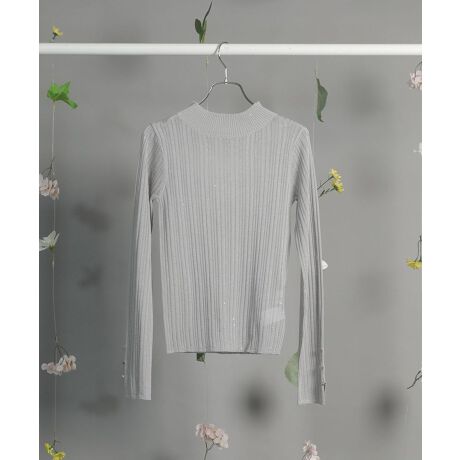 シアー感が上品なニットプルオーバー。コンパクトなフォルムでスタイルを美しく見せ、シャツのレイヤードやキャミワンピースのインナーにもぴったりなアイテムです。小さなスパンコールを散りばめた控えめな光沢感と袖先のハートボタンがアクセント。ベーシックなカラーでスタイリングしやすいのも特徴です。透け感[ややあり]