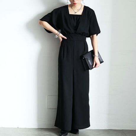 ハンサムレディに仕立てる、美形ジャンプスーツ。上身頃の内側にはキャミソール型のインナーがドッキングしているので、これ一枚で完結!着るだけでスタイルアップ!キュッとくびれメイク&脚長ワイドパンツ。ウエスト部分はバックゴムなので快適な着心地です。バックリボン&スリットで後ろ姿まで美しい佇まいを演出。ベルスリーブで二の腕周りを隠せるのもうれしいポイント!キレイめ質感のジョーゼット生地は、オケージョンシーンにも活躍します。